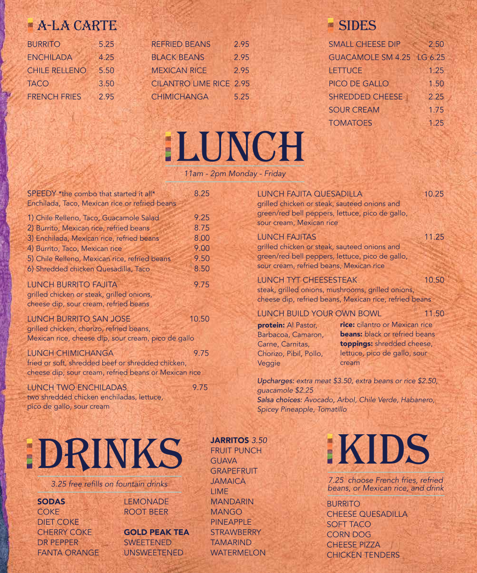 The menu boasts an impressive selection. For lunch, options like the Speedy Enchilada and Lunch Combo #1 offer satisfying choices at great prices. Signature specials like the Carnitas and Chimichangas are crafted with fresh ingredients and rich flavors, ensuring a feast for the senses.